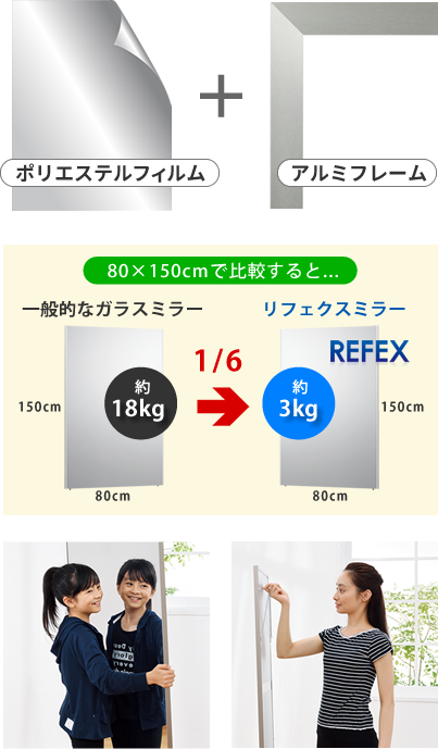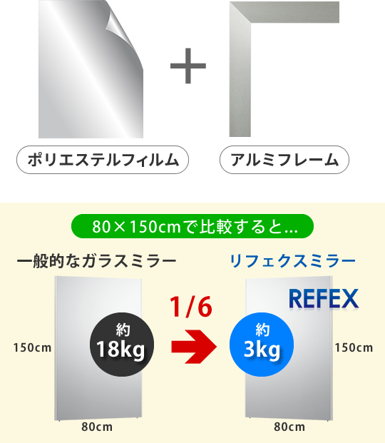 特殊加工のポリエステルフィルムと軽量のアルミフレーム製なので、一般的なガラスミラーと比べて、約1/6という驚きの軽さです。
