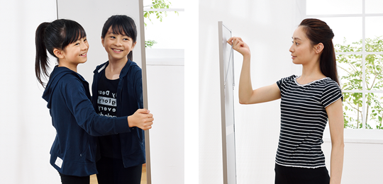 万が一、倒したり、ぶつかったりしても、割れて破片が飛び散ることがないので安全です。これまでに50万枚以上のメーカー出荷実績があり、姿見だけでなく、ダンス、ヨガ、スポーツ、医療施設、介護施設、ショッピングモールなどで幅広く使われています。