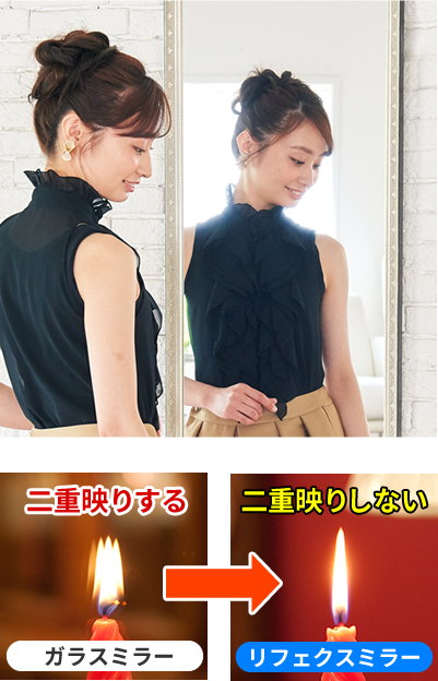 リフェクスミラーは25ミクロン(0.001ミリ)と極薄なので、ほとんど二重映りがありません。メリット- 姿見やダンスなどの用途に使える