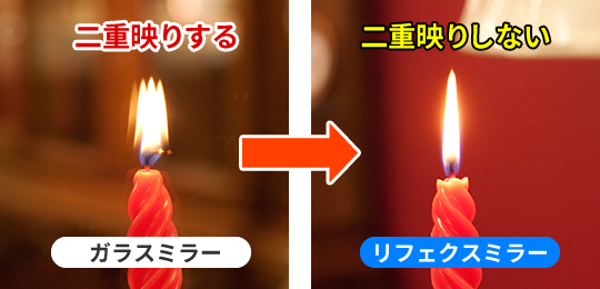 二重映りとは鏡には厚さがありますので、表面と裏面(銀膜)それぞれの反射のズレが二重映りになります。
