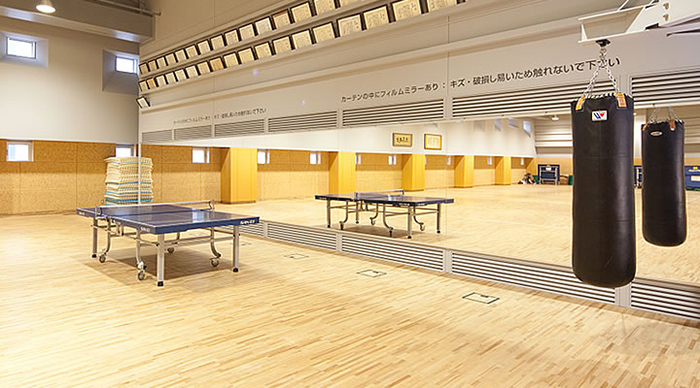 体育館の壁一面に設定しています。ボールがぶつかっても割れないので、スポーツ施設全般で広く使われています。